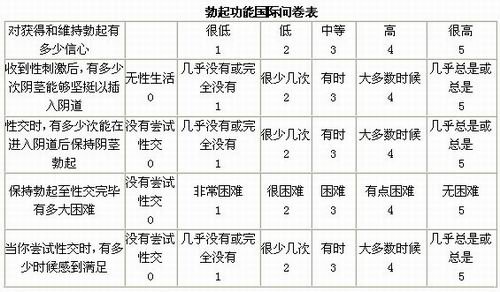 1998年,Rusen按勃起功能障碍的定义,将以往复杂的问卷表简化成只有5个问题的勃起功能国际问卷表(IIEF-5),由病人回答过去6个月中的情况。它涉及勃起功能的3个问题、性生活总体满意度和病人对阴茎勃起涉及维持勃起的信心各1个问题。他们用IIEF-5评估了1152名男性(其中1036例有不同程度勃起功能障碍,116例无勃起功能障碍),评分低于或等于21,诊断为勃起功能障碍;评分高于21,诊断为无勃起功能障碍。其敏感度为98%,特异性为88%。可见勃起功能国际问卷表(IIEF-5)是了解是否患有勃起功能障碍及其程度的简便易行的方法。